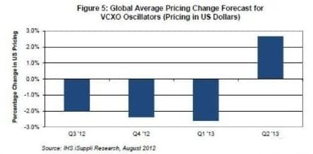 这与今年稍早的展望截然不同,当时看来许多元件类别的价格将会上涨。这种不如人意的价格走势在振荡器身上得到体现,这是一种大批量元件,广泛用于手表、笔记本电脑、手机等电子产品之中。尤其是,电压控制晶体振荡器(VCXO)的价格第三季度预计下降2.0,第四季度下跌2.4,2013年季度下跌2.6,如图所示。而在通常情况下,其每季度价格跌幅是1.0-2.0。