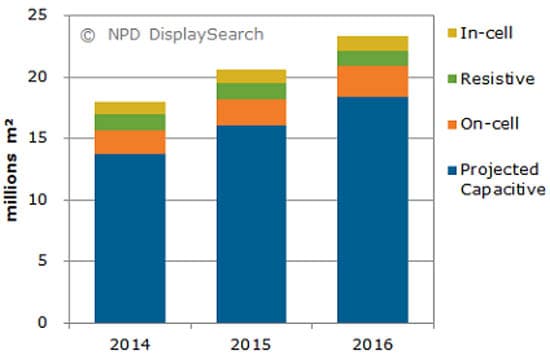 不论是采用玻璃或是塑料薄膜作为传感器基板,两者均往更轻、更薄与更好的光学透光度方向上改进。在NPDDisplaySearch*新出版的“触控传感器市场和演变报告”(TouchSensorMarketandEvolutionReport)中,预测了传感器的总出货面积将从2014年的1,800万平方米增至2015年的2,330万平方米;其中包含了各种主要的传感器结构与技术,像是投射电容式、in-cell面板嵌入式、on-cell面板嵌入式和电阻式。另外,以塑料薄膜为基板的各种传感器结构,其总比重也大于以玻璃为基板者。