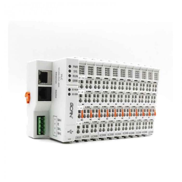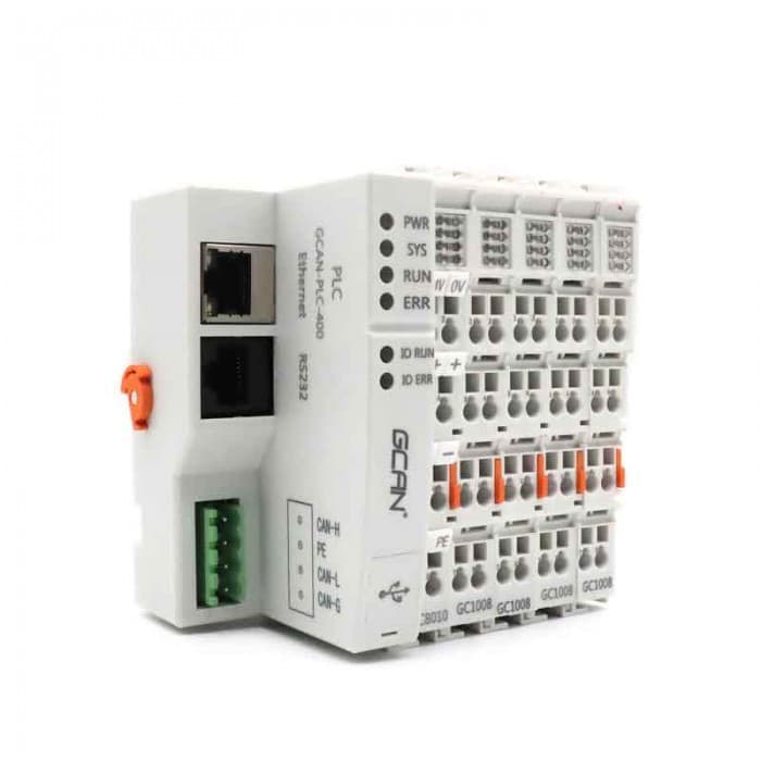 GCAN-PLC系列产品由一个可编程的主控模块(GCAN-PLC-400)、若干GC系列IO模块(GC-1008、GC-3804等)以及一个终端端子模块组成。GCAN-PLC-400主控模块可连接所有的GC系列IO模块,用户可根据现场实际需求自行选择扩展IO模块,扩展IO模块数量可达32个。GCAN-PLC-400主控模块支持自动组态,用户无需在PC上设置参数,主控模块将根据插入端子模块的前后位置自动组态。