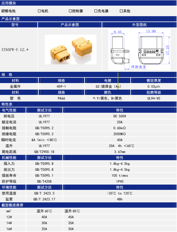 AMASS厂家直销大电流直流25A插头插座XT60PW认证齐全