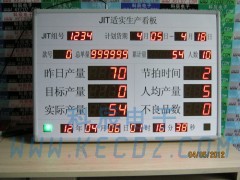 电子看板是专门为生产型企业设计的生产线看板,用于标示当天或当班的计划生产量、实际生产量、差异值、不良品、达成率、不良率等参数。其中计划生产量等可以由计算控制输入、遥控器或键盘输入,实际生产量,不良品等通过检测安装在生产线上的红外感应开关、行程开关等自动录入或通过按键录入,差异值、达成率、不良率等由看板内部的单片机计算并显示出来。电子管理看板的应用将有利于提高企业管理水平、降低企业的劳动力成本、激发员工的生产积极性等从而使企业获得更大的利润空间。