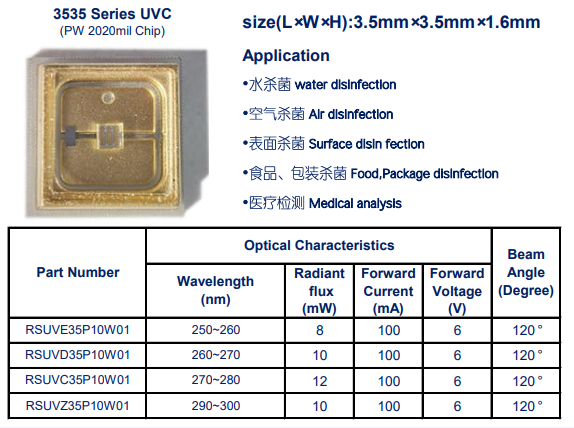 标题:3535 275nm 12mW 100mA UVC LED PKG 紫外发光二极管