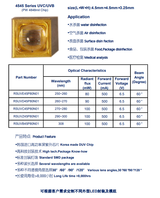 标题:4545 275nm 90mW 500mA UVC LED PKG 紫外发光二极管