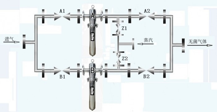 一备一用使用方法A过滤器使用①.打开A1 A2阀门,②.关闭B1 B2 Z1 Z2阀门,使用3天后A过滤器需要蒸汽灭菌时切换至B过滤器使用①.打开B1 B2,②.关闭A1 A2,③.打开Z1(蒸汽阀门) ④20-30分钟后关闭Z1,同样方式切换AB过滤器 交替使用,如有特大疫情真空泵超负荷运行可以同时使用A B二台过滤器①.打开A1 A2 B1 B2阀门,②.关闭Z1 Z2阀门